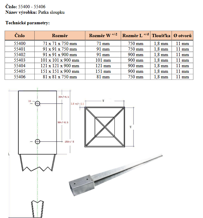 Varianta: Patka sloupku 101x101x150mm/75cm tl. 1.8mm ZN