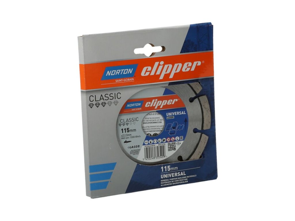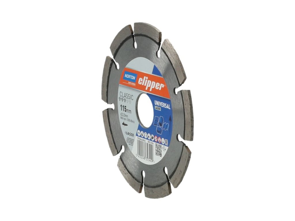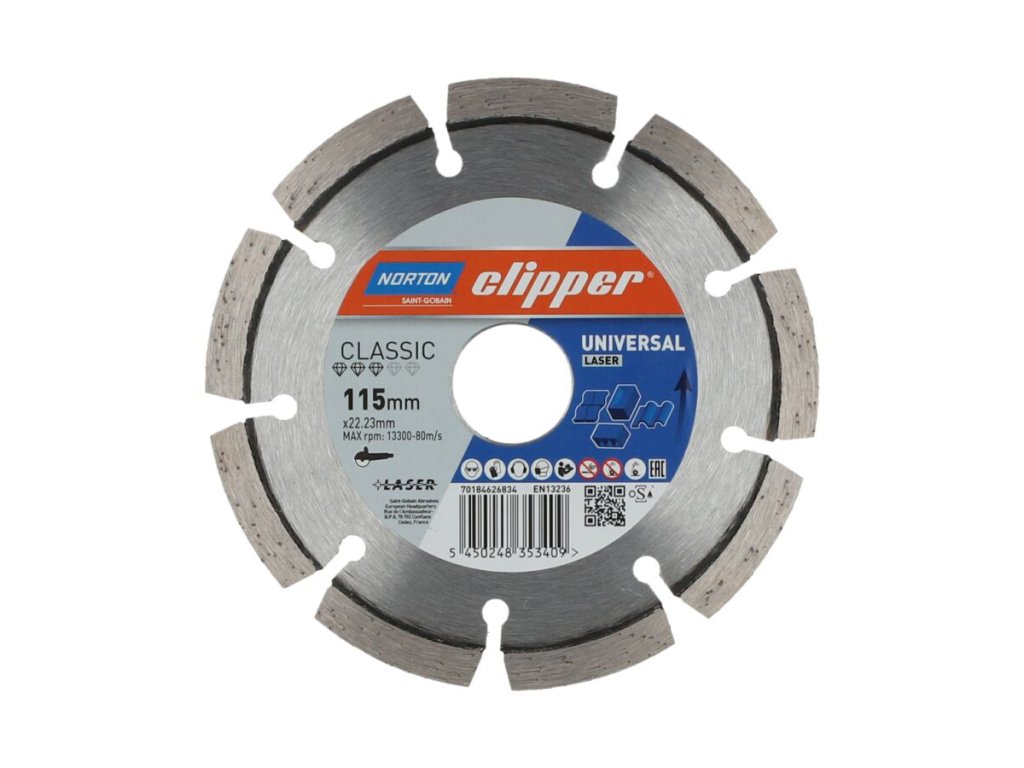 Řada Norton Clipper nabízí širokou škálu bezpečných a výkonných diamantových kotoučů. CLASSIC UNIVERSAL LASER je laserem svařovaný diamantový kotouč s dobrým poměrem ceny a výkonu pro suché a mokré řezání. Použití: běžné stavební materiály.
