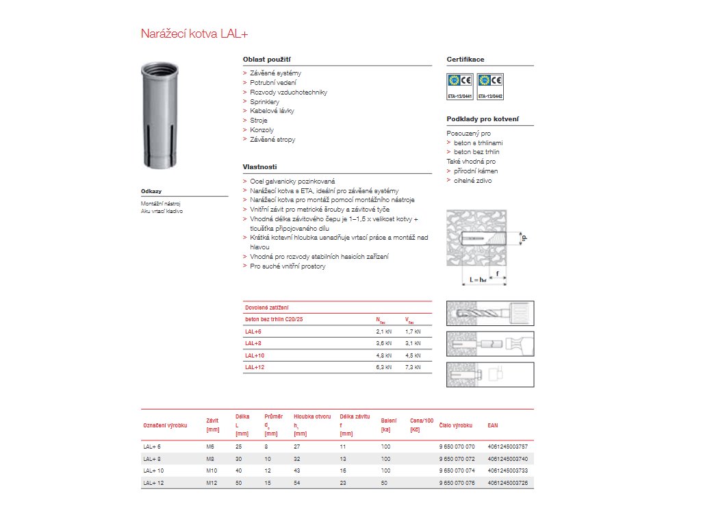 • Účinná kotevní hloubka hef: 25 mm/ 30 mm/ 40 mm/ 50mm