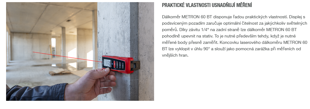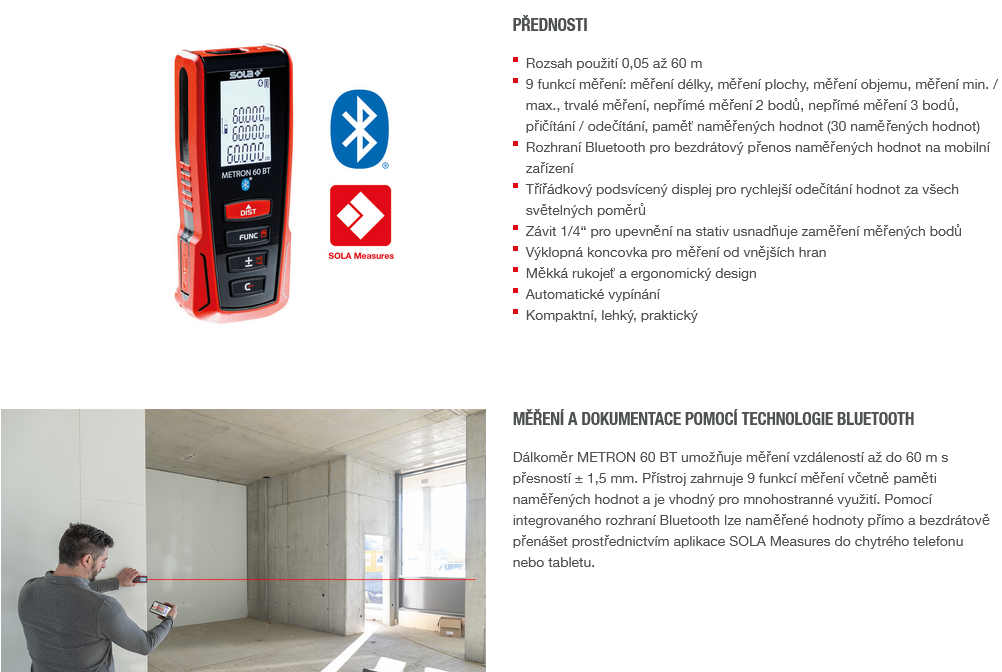 Laserový dálkoměr, METRON 60 BT, délka 119 mm, rozměr 119 x 46 x 28 mm, SOLA