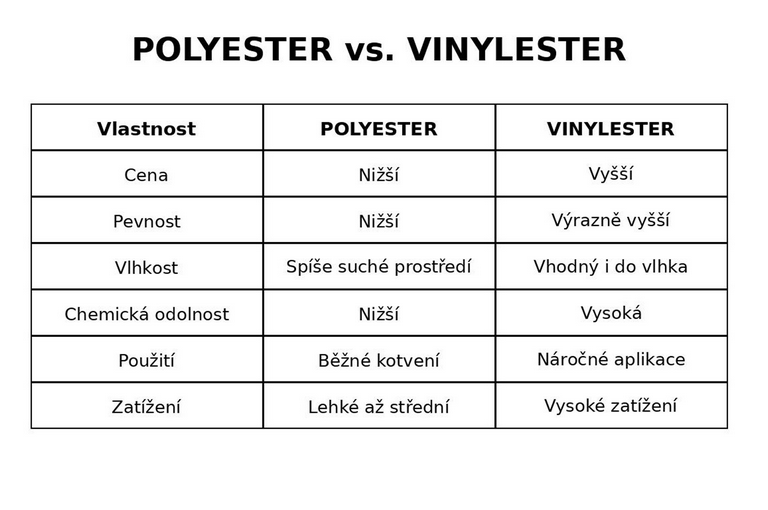 Chemická kotva POLYESTER je určena pro pevné kotvení závitových tyčí, armatur a kovových prvků do betonu, zdiva či kamene. Dvousložková polyesterová malta bez styrenu poskytuje vysokou mechanickou pevnost bez rozpěrných sil, což umožňuje bezpečné použití i v blízkosti okrajů. Vhodná také do dutých materiálů při použití sítka. Reaguje i v uzavřených prostorech. Polyesterová chemická malta je cenově dostupné řešení vhodné pro běžné kotvení do betonu a zdiva bez vysokého zatížení, avšak oproti vinylesteru nabízí nižší pevnost a odolnost vůči vlhkosti i chemickému zatížení. Je cenově dostupnější a má praktické řešení pro běžné kotvení do betonu a zdiva bez vysokého zatížení, přičemž oproti vinylesteru nabízí nižší pevnost, menší odolnost vůči vlhkosti a chemickému zatížení, a proto je vhodná spíše pro standardní aplikace v suchém prostředí.