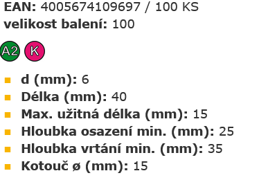 Natloukací hmoždinka 6.0x40 zápustná hlava s těsněním 15mm, nerez A2