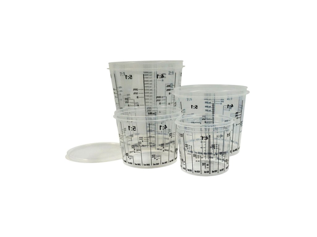 Jednorázové plastové mísicí nádoby pro přípravu barvy a skladování všech nátěrů. Tyto vysoce odolné nádoby potištěné sedmi různými směšovacími poměry pro kompletní měření jsou pružné, s patkami, které chrání proti přenosu chladu při mísení.