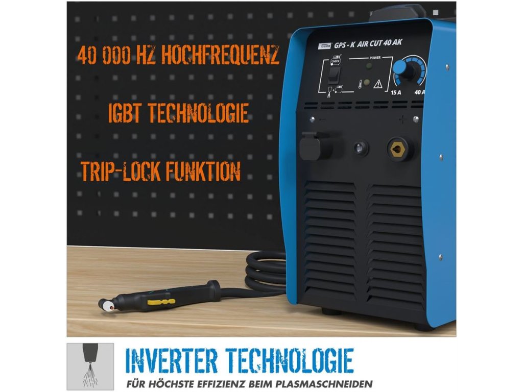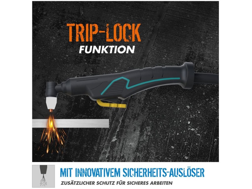 Vysokofrekvenční (bezkontaktní) zapalování oblouku • výkonové spínací tranzistory IGBT • plynulé nastavení řezacího proudu (rozsah: 15 - 40 A) • hořák s bezpečnostním spínačem TRIP-LOCK.