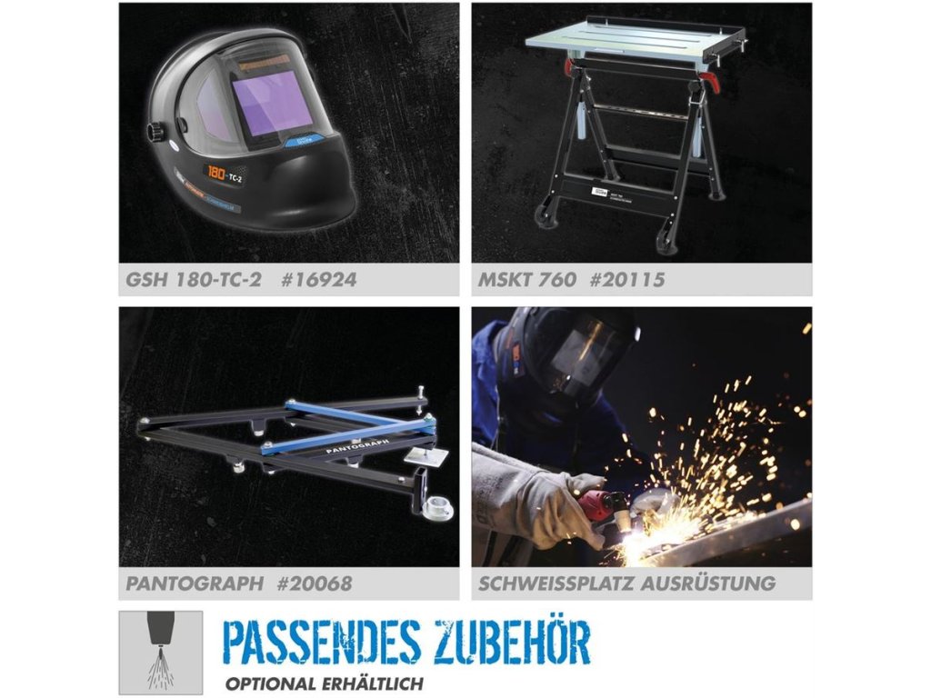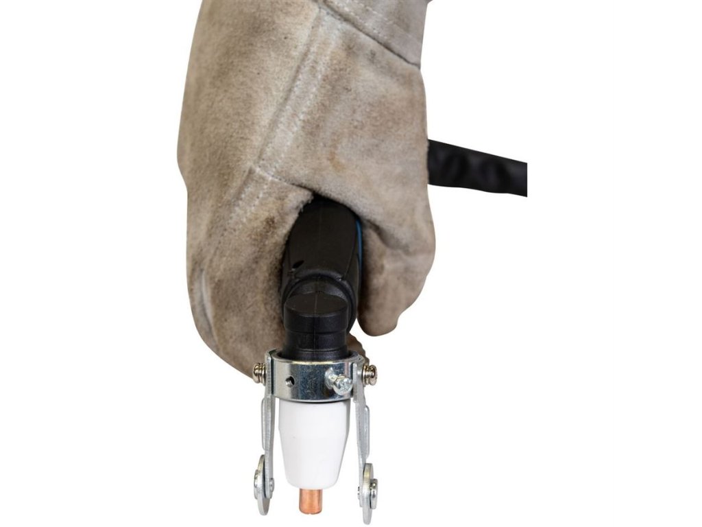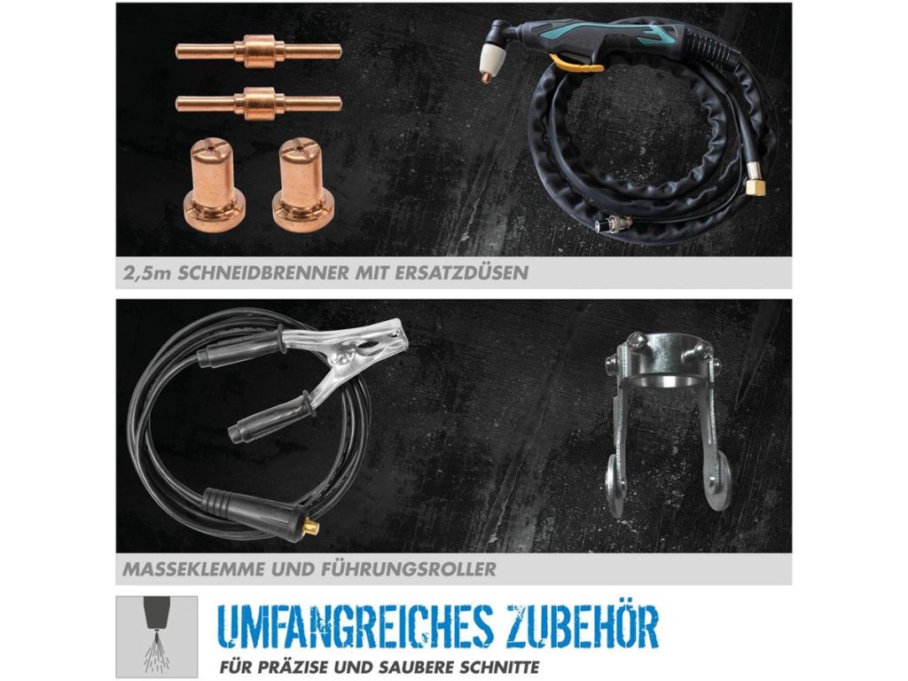 Vybavení: 2,5 m plazmový hořák, zemnicí kabel se svorkou, řezací trysky Ø 1,2 mm (2), elektrody (2), distanční vodítko.