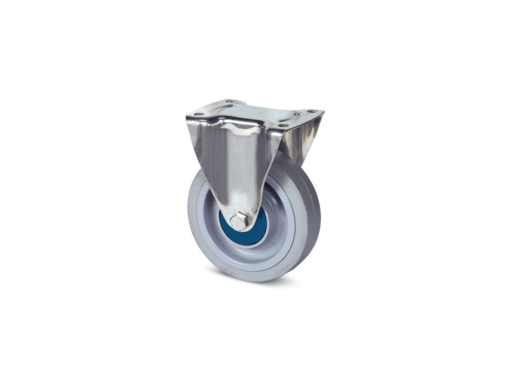 Pevné kolečko, Vidlice vyrobena z nerezové oceli, kolo se šroubem a maticí, uchycení s plotýnkou. Střed kola vyroben z polyamidu, Běhoun: elastická guma, šedá-neznačkující, malý protivláknový kryt, přesné kuličkové ložisko, utěsněné, utěsněné