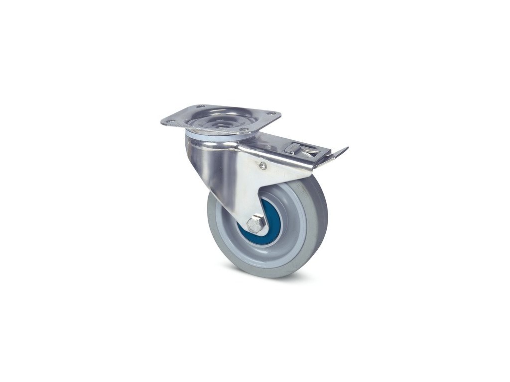 Otočné kolečko s totální brzdou, v zadní části kola, Vidlice vyrobena z nerezové oceli, dvojitá kuličková dráha v otočné hlavě kolečka, kolo se šroubem a maticí , uchycení s plotýnkou. Střed kola vyroben z polyamidu, Běhoun: elastická guma, šedá-neznačkující, malý protivláknový kryt, přesné kuličkové ložisko, utěsněné, utěsněné