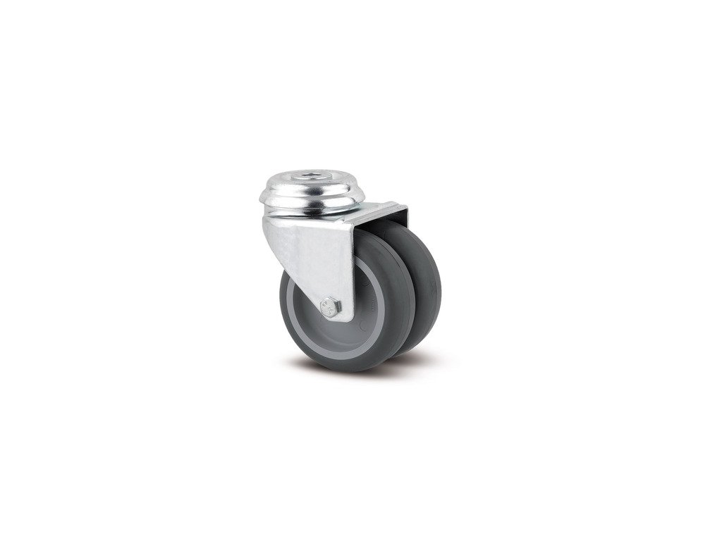 Otočné kolečko, Vidlice kolečka vyrobena z ocelového výlisku, pozinkováno, dvouřadá kuličková dráha v otočné hlavě, kolo uchyceno šroubem a matkou, otvor pro čep. Střed kolečka vyroben z polypropylénu, Běhoun: TENTEprén (termoplastická guma), neznačkující, kluzné uložení