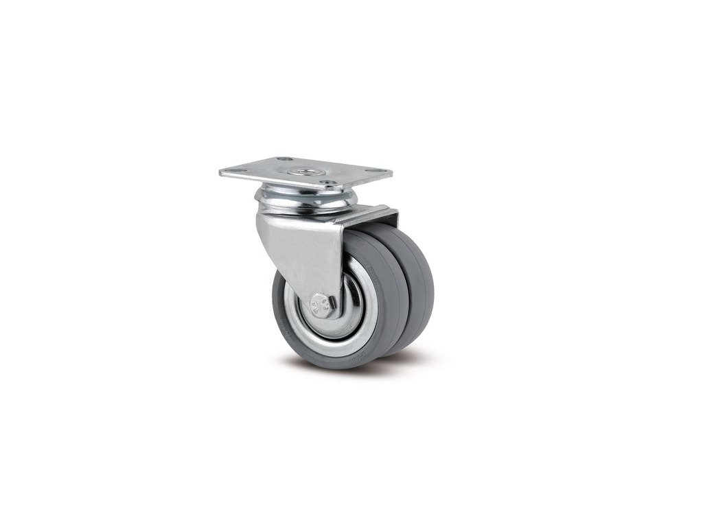 Otočné kolečko, Vidlice kolečka vyrobena z ocelového výlisku, pozinkováno, dvouřadá kuličková dráha v otočné hlavě, kolo uchyceno šroubem a matkou, uchycení s plotýnkou. Střed kolečka vyroben z ocelového výlisku, Běhoun: guma, šedá neznačkující, protivláknové kryty, kuželové ložisko