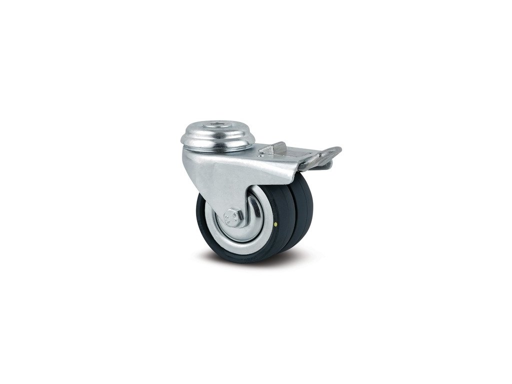 Otočné kolečko s totální brzdou, v zadní části kola, Vidlice kolečka vyrobena z ocelového výlisku, pozinkováno, dvouřadá kuličková dráha v otočné hlavě, kolo uchyceno šroubem a matkou, otvor pro čep. Střed kolečka vyroben z ocelového výlisku, Běhoun: gumová obruč, černá-nečernící, protivláknové kryty, kuželové ložisko