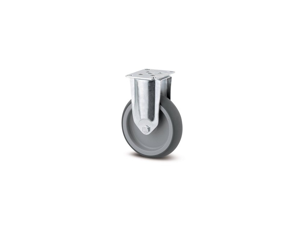 Pevné kolečko, Vidlice vyrobena z ocelového výlisku, zinkochromátováno, kolečko se šroubem a maticí, uchycení s plotýnkou. Podélná strana upevňovací desky příčně ke směru jízdy. Střed kolečka vyroben z polypropylénu, Běhoun: TENTEprén (termoplastická guma), neznačkující, kluzné uložení