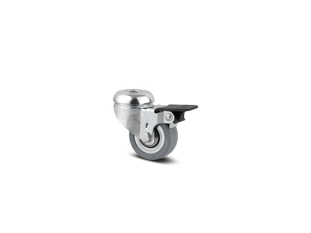 Otočné kolečko s brzdou kola, Vidlice vyrobena z ocelového výlisku, pozinkováno, dvojité kuličkové ložisko v otočné hlavě, kolečko se šroubem a maticí, otvor pro čep. Střed kolečka vyroben z ocelového výlisku, Běhoun: guma, šedá neznačkující, protivláknové kryty, kuželové ložisko Kolečko může být namontováno se standardními šrouby s libovolnou délkou.