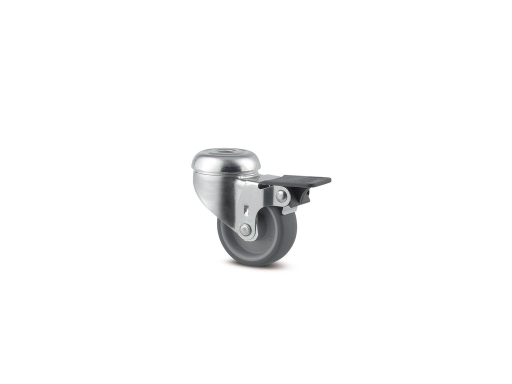 Otočné kolečko s brzdou kola, Vidlice vyrobena z ocelového výlisku, pozinkováno, dvojité kuličkové ložisko v otočné hlavě, střed nýtován, otvor pro čep. Střed kolečka vyroben z polypropylénu, Běhoun: TENTEprén (termoplastická guma), neznačkující, kluzné uložení Kolečko může být namontováno se standardními šrouby s libovolnou délkou.