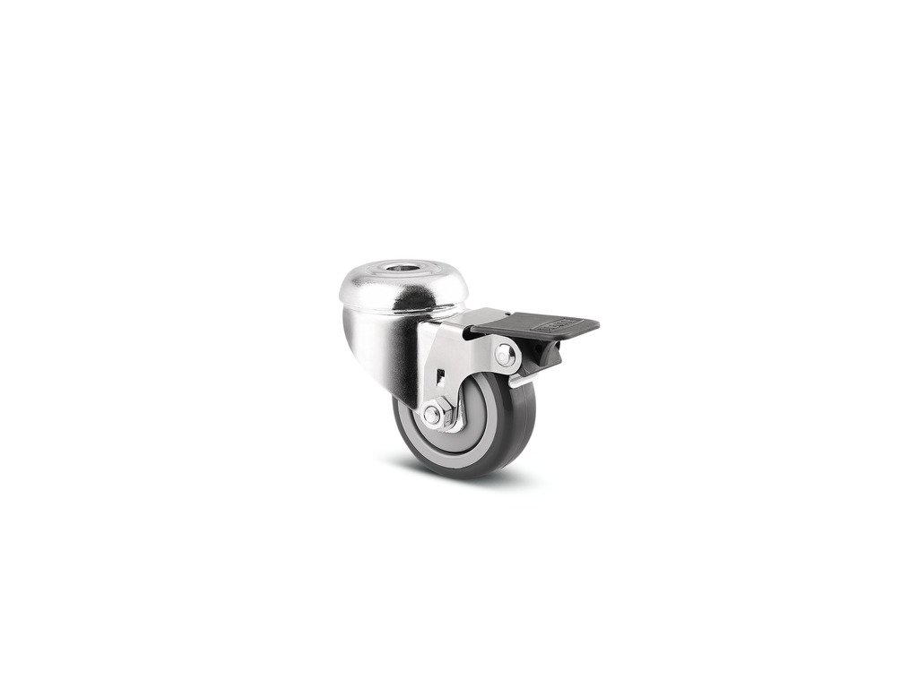 Otočné kolečko s brzdou kola, Vidlice vyrobena z ocelového výlisku, pozinkováno, dvojité kuličkové ložisko v otočné hlavě, otvor pro čep. Střed kolečka vyroben z polyamidu, vysoké zatížení, kluzné uložení, Běhoun: polyuretan, přesné kuličkové ložisko , s protivláknovými kryty Kolečko může být namontováno se standardními šrouby s libovolnou délkou.