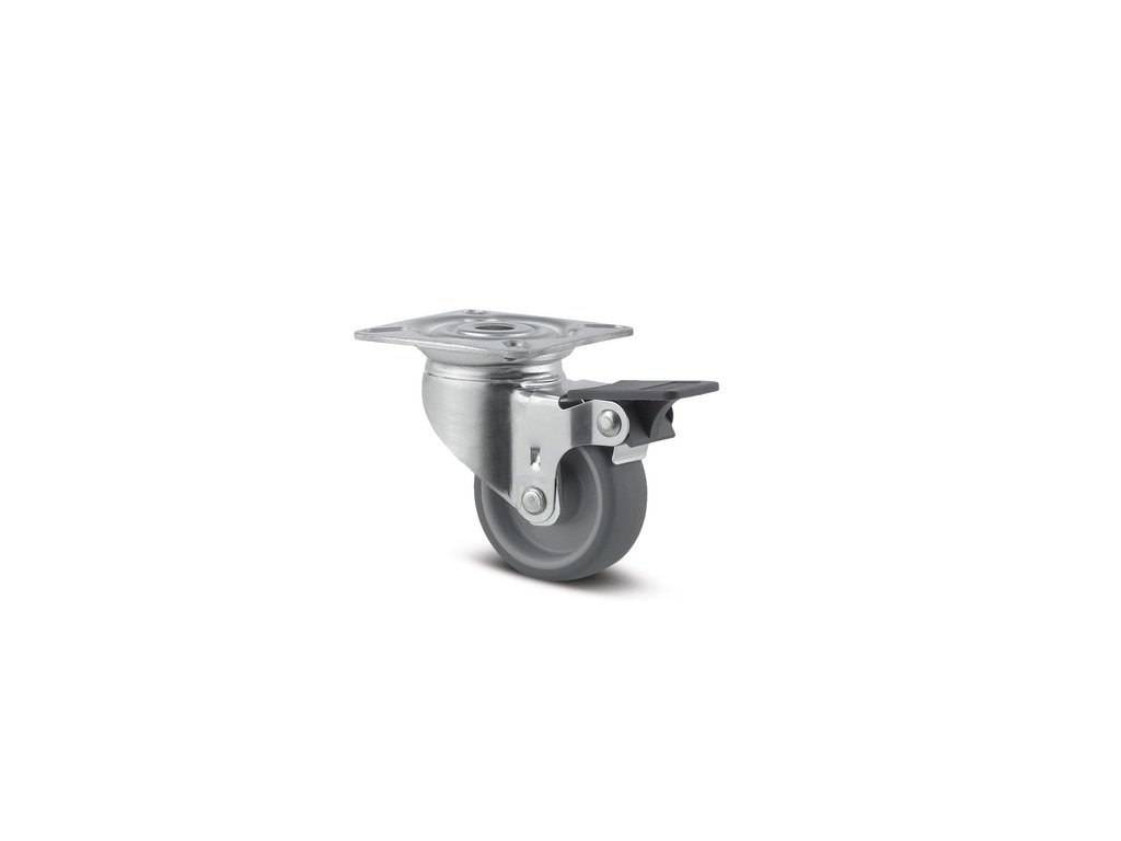 Otočné kolečko s brzdou kola, Vidlice vyrobena z ocelového výlisku, pozinkováno, dvojité kuličkové ložisko v otočné hlavě, střed nýtován, uchycení s plotýnkou. Střed kolečka vyroben z polypropylénu, Běhoun: TENTEprén (termoplastická guma), neznačkující, kluzné uložení