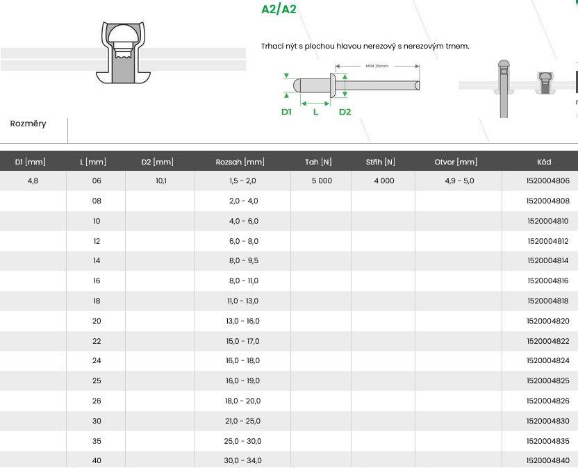 A2/A2 nerezový nýt, nerezový trn( nerez A2)