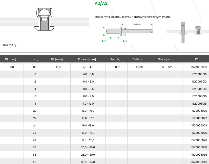 A2/A2 nerezový nýt, nerezový trn( nerez A2)
