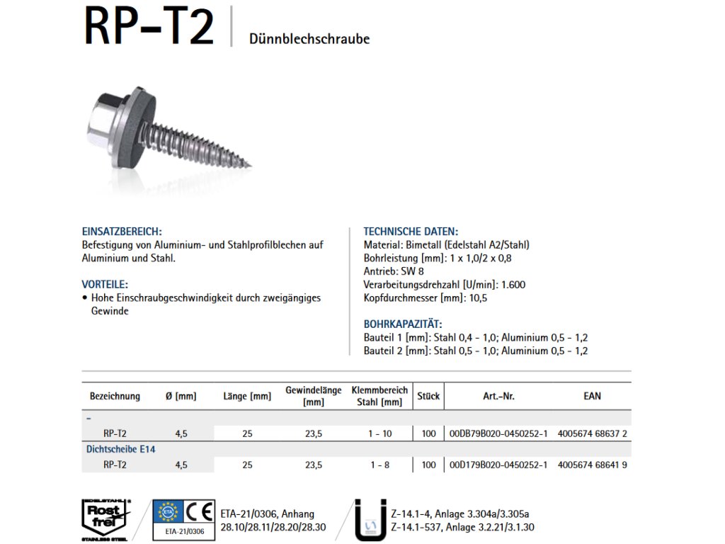 Varianta: RP-T2, spojovací šroub na tupo 6,0x38/E16 BiMetall A2