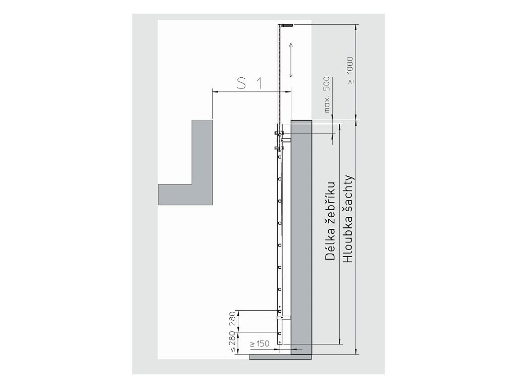 Vnitřní šířka 300 nebo 400 mm Vnější šířka 340 nebo 440 mm Nosné profily 50 x 20 mm Děrované příčle 29 x 29 mm Pokud je šachetní žebřík delší než 5 m, je třeba použít ochranu před pádemDoplňkové parametry