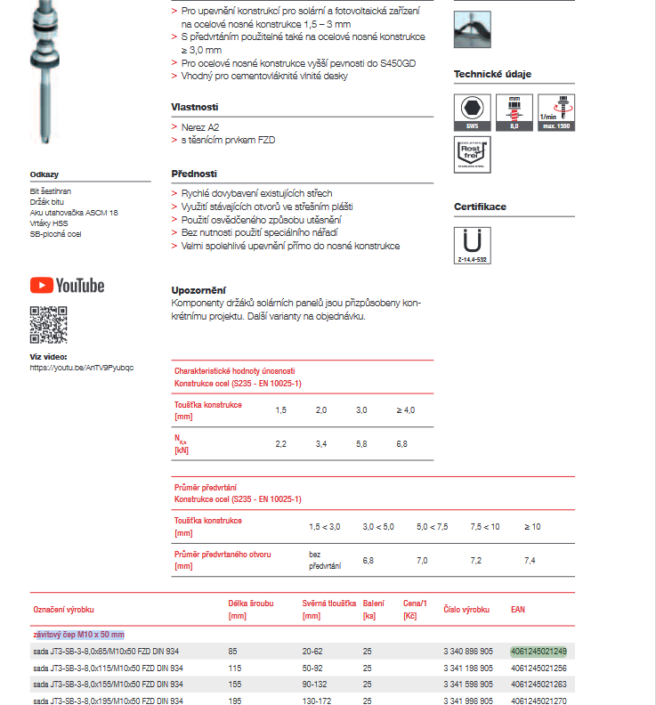 EJOT® Držák solárních zařízení JT3-SB-3-8,0xL ávitový čep M10 x 50 mm