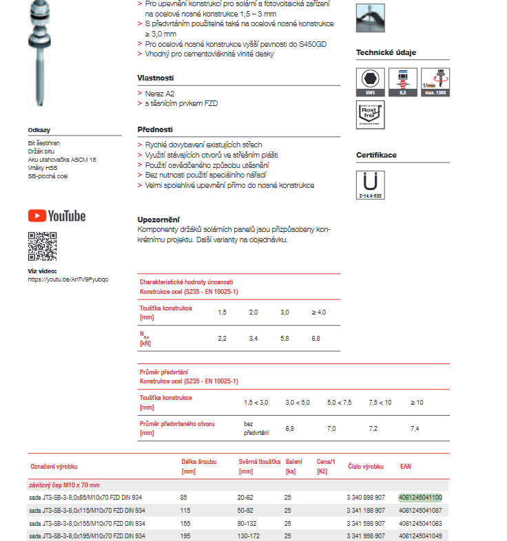 EJOT® Držák solárních zařízení JT3-SB-3-8,0xL závitový čep M10 x 70 mm