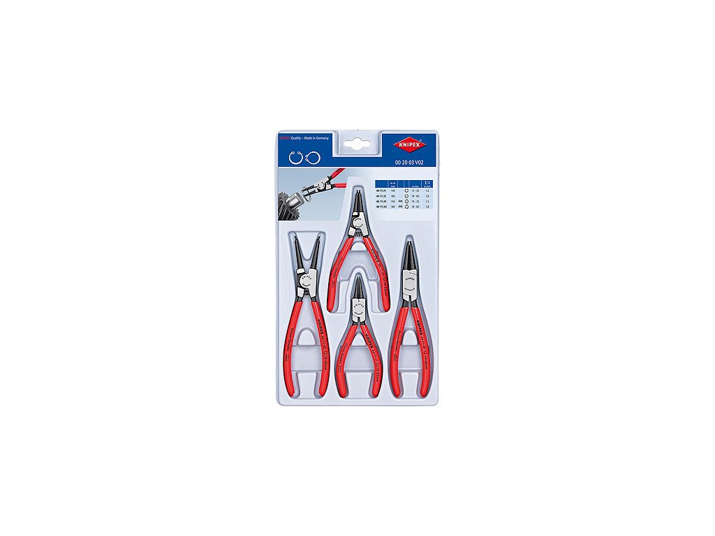 Vybaveno běžnými kleštěmi na pojistné kroužky pro vnitřní i vnější kroužky Atraktivní prodejní balení s děrováním pro samoobslužný prodej Stabilní plastový obal; vhodný také k dalšímu uložení kleští Model 00 20 03 V02 : 4-dílný Č. výr.EAN 4003773- Počet Tvar Ø mm g 00 20 03 V02 077640 Sada kleští na pojistné kroužky 450 44 11 J1 Kleště na pojistné kroužky, pro vnitřní kroužky v otvorech 1 rovné hroty 12 - 25 44 11 J2 Kleště na pojistné kroužky, pro vnitřní kroužky v otvorech 1 rovné hroty 19 - 60 46 11 A1 Kleště na pojistné kroužky, pro vnější kroužky na hřídelích 1 rovné hroty 10 - 25 46 11 A2 Kleště na pojistné kroužky, pro vnější kroužky na hřídelích 1 rovné hroty 19 - 60Doplňkové parametry