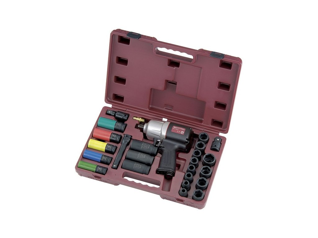 Souprava pneumatický rázový utahovák COMPOSIT INDUSTRI s příslušenstvím, uloženo v plastovém kufru.- 24-dílná souprava pneumatického nářadí - 1/2" pneumatickým úderovým utahovákem - úderový mechanismus Twinhammer - nárazuvzdorné kompozitní pouzdro - maximální kroutící moment 1486 Nm - určený pro velkou zátěž - nástavce, materiálnikl-chrom-molybden-ocelDoplňkové parametry