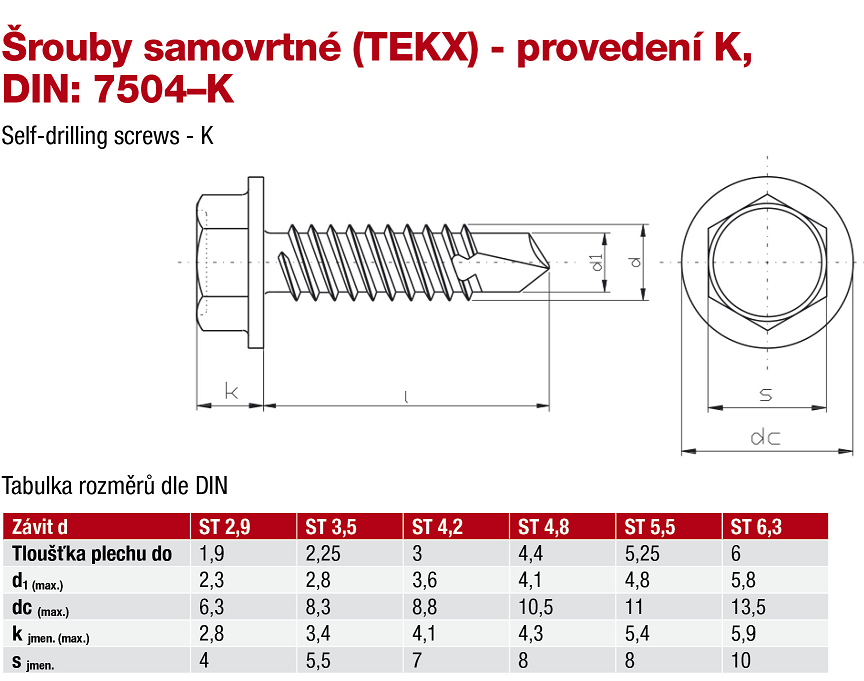 Varianta: Samovrtný šroub se šestihrannou hlavou DIN7504K 3.9x19, ocel pozink