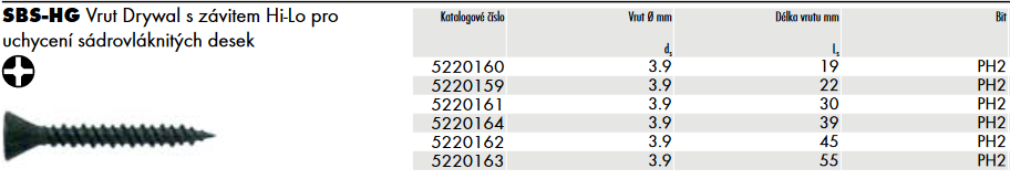 Varianta: SBS-HG 3,9 x 19 vrut Drywal mungo se závitem Hi-Lo pro uchycení sádrovláknitých desek