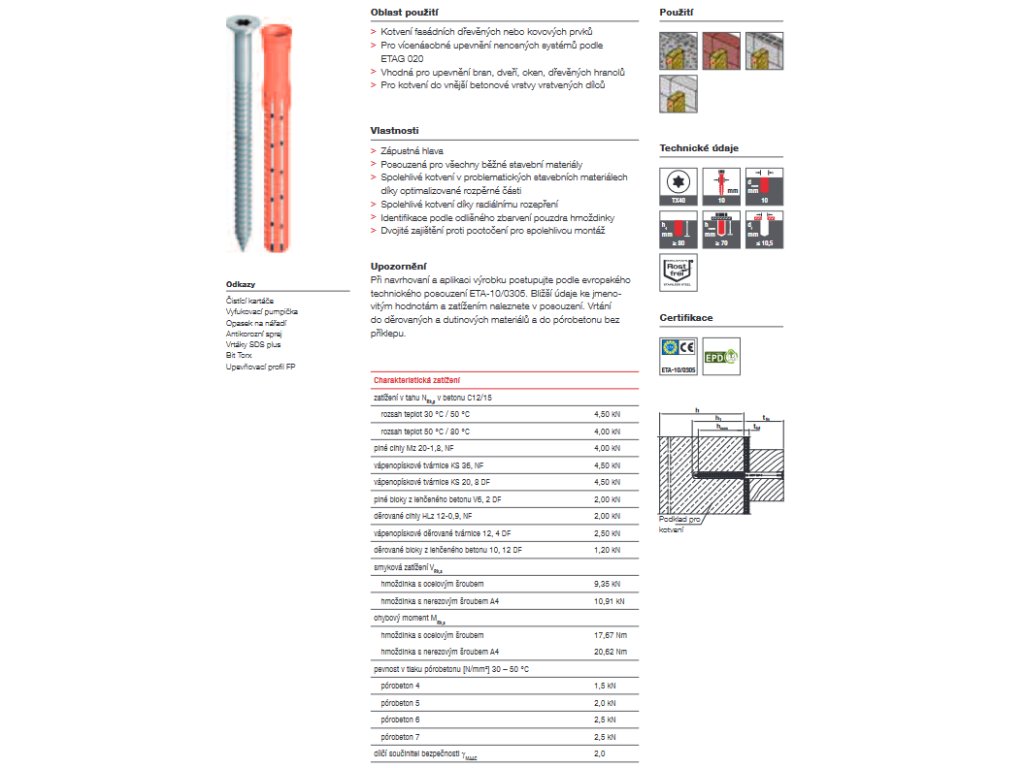 - Účinná kotevní hloubka v betonu hnom: ≥ 70 mm