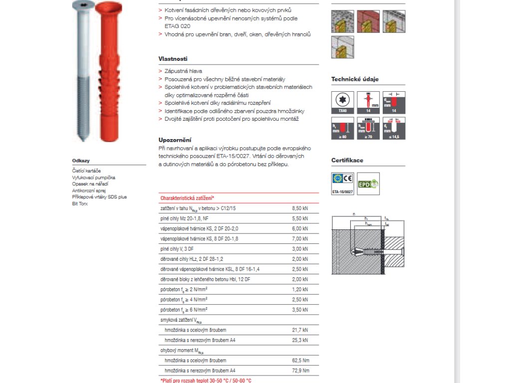 - Zatížení v tahu NRk,pv betonu > C12/15: 8,50 kN