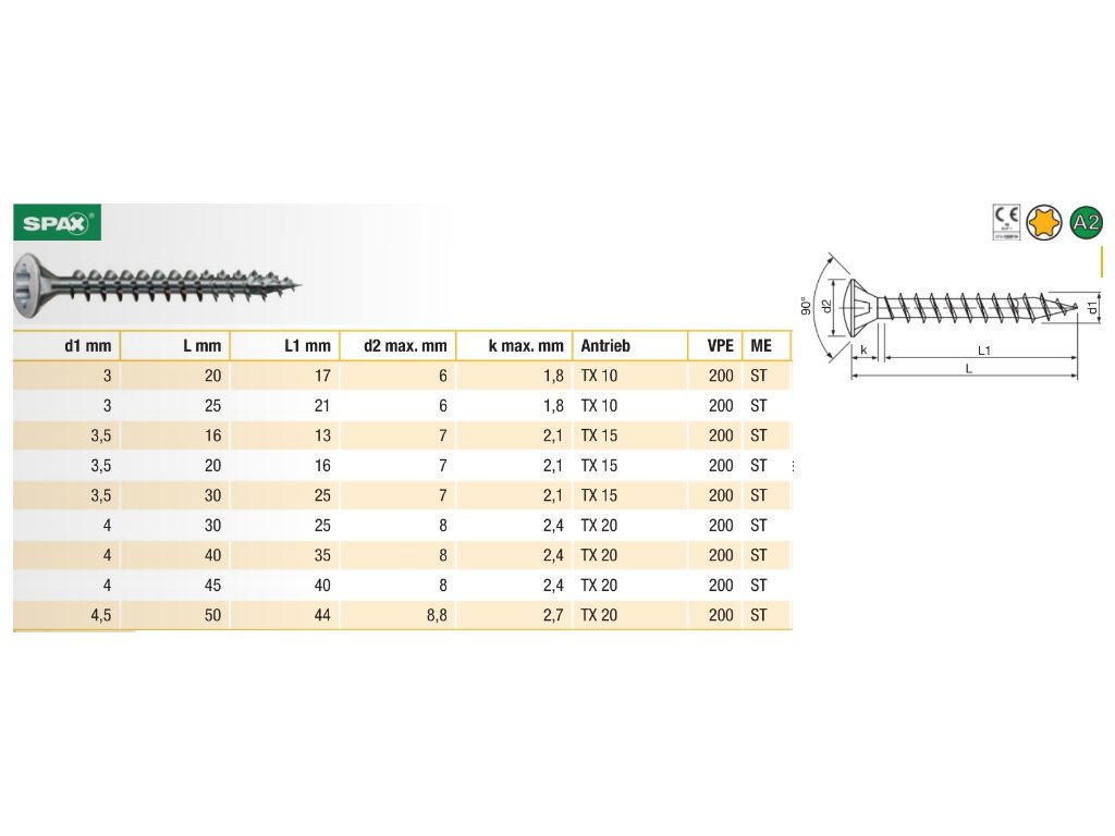 Varianta: SPAX čočková zápustná hlava 4.0x 45 plný závit TX20 nerez A2, s certifikátem
