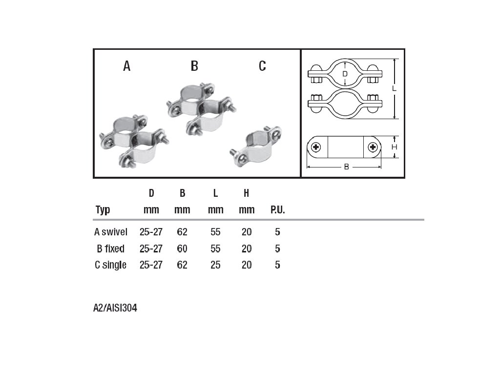 Varianta: Trubková svorka dvojitá otočná pro D= 25-27 mm, nerez A2 - AISI 304