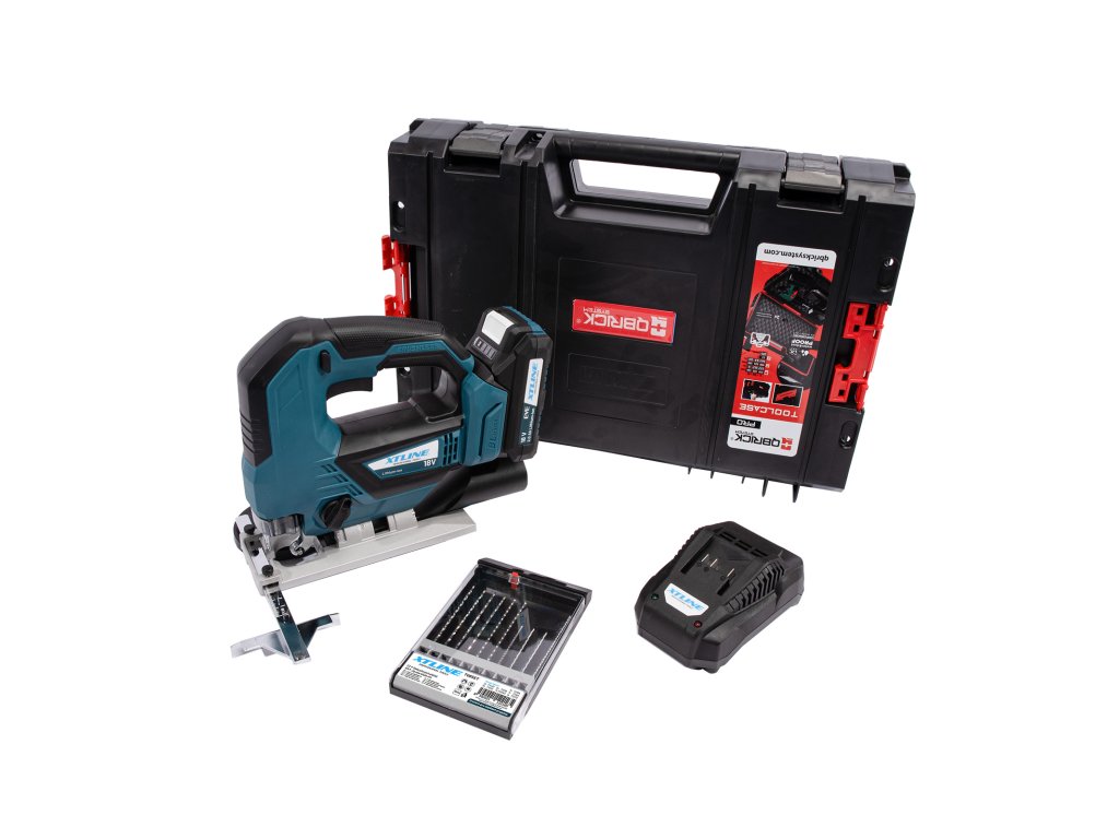 XTLINE Aku přímočará pila bezuhlíková 18 V + baterie 2.0 Ah + nabíječka 2.4 A + pilové plátky + box