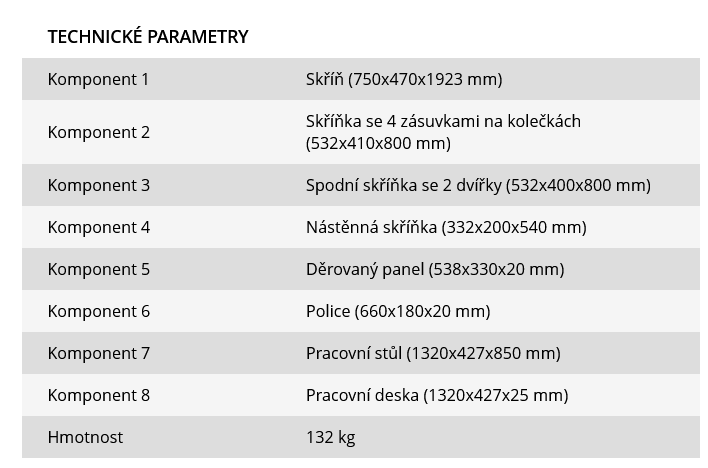 | Komponent 8: | Pracovní deska (1320x427x25 mm) |