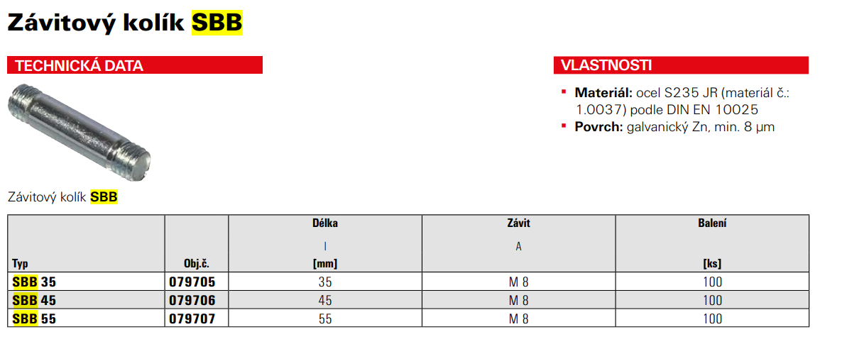 fischer závitový kolík SBB je upevňovací prvek z galvanicky zinkované ocele. Kombinuje se s patními deskami, dvojitým držákem a montážními úhelníky.